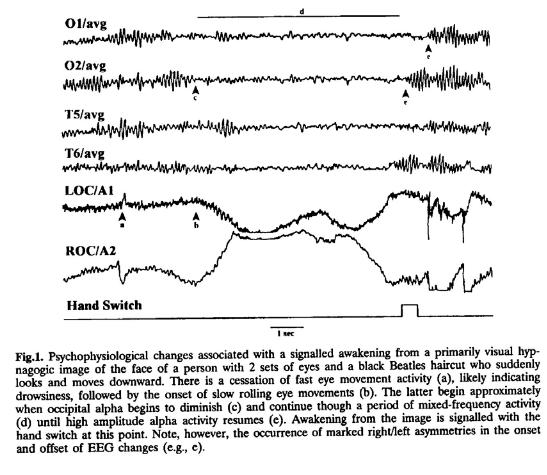 variable, the pattern of EEG changes was similar from image to image. These findings suggest that the production of hypnagogic imagery for this observer may have a more or less invariant underlying physiological pattern. The relationship of this pattern to that of the previously-described phenomenological events remains tobe clarified. However, it seems likely that the observed in EEG activity correspond to periods of activation and deactivation of hypnagogic imagery processes * In most cases, cessation of eye activity was followed by a diminution in alpha activity and EEG amplitude across most channels and an increase in the prevalence of other frequency bands.