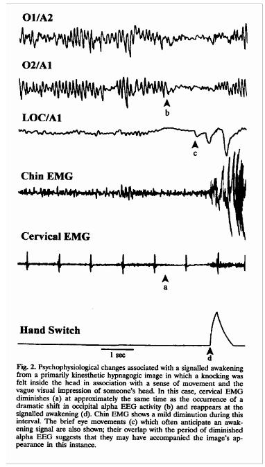 arly accompany hypnagogic images, such as limb jerks, were found to be isomorphic with some imagery content. In Study 1 (fully-formed images), phasic NMEs were found to accompany 56.7% of images. In Study 2 (fleeting images), this proportion was only 16.7%. However, the proportions of phasic NME types for the two classes of imagery were strikingly similar: head tilts (61.5% v. 56.4%), leg jerks (23.1% v. 23.1%), arm jerks (7.7% v. 15.4%) and whole body jerks (7.7% v. 5.1%) respectively. It seems likely that many NMEs accompanying fleeting images were too subtle or transient to be detected by this self-observation technique, a possibility supported by physiological recordings, such as those in Study 3.