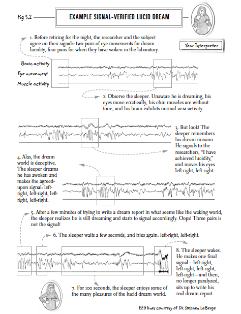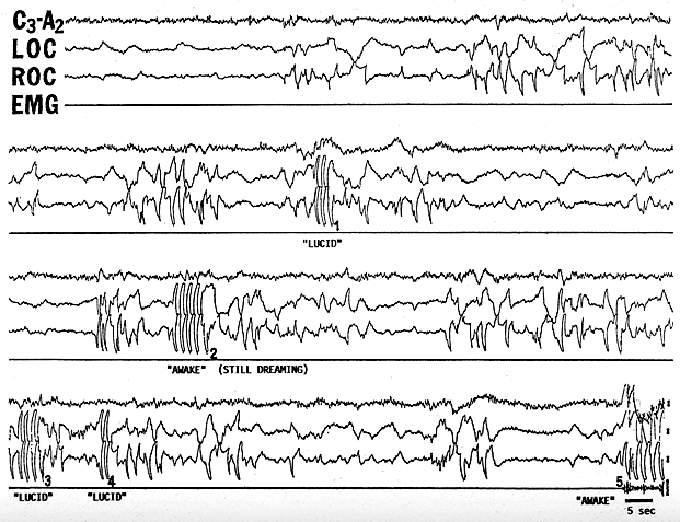 Earlier studies showing that some of the eye movements of REM sleep corresponded to the reported direction of the dreamer's gaze (e.g., Roffwarg et al. 1962).LaBerge test this - asked subjects to carry out distinctive patterns of voluntary eye movements when they realized they were dreaming. The prearranged eye movement signals appeared on the polygraph records during REM, proving that the subjects had indeed been lucid during uninterrupted REM sleep (LaBerge 1990; LaBerge et al. 1981). Figure 1 shows an example.