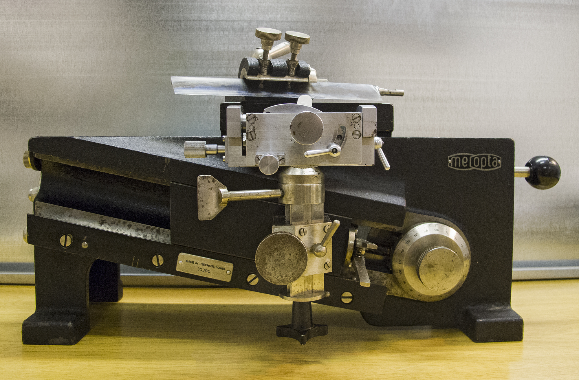 Pro presnejsi histologickou praci stoji na mikroskopovacim stole mikrotom Meopta 596 C8. Je to poradny kus kovu, prosime nepresouvat ;] Nuz je k dispozici na vyzadani pote co bude zajemce obeznamen s funkci pristroje, bez toho je velice snadne se nozem zranit nebo ho znicit [popripade oboji]. Mikrotom je vhodny pro rezani tkani zalitych do parafinu, tloustka rezu je nastavitelna do 3 um.